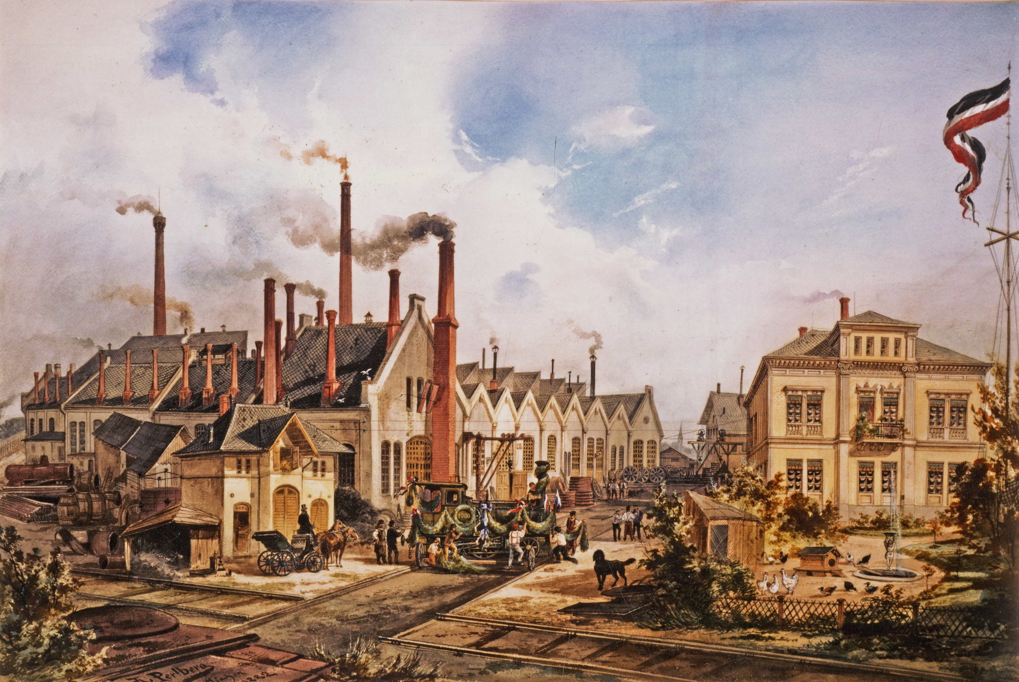 Die Industrialisierung setzt in Bayern um 1840 vergleichsweise spät ein, nimmt aber in den 1880ern Jahren rasant an Fahrt auf. Georg Krauss und Joseph Anton von Maffei produzieren in ihren Fabriken modernste Lokomotiven für den europäischen Markt. Krauss-Maffei wird das Markenzeichen für die bayerische Industrie. Die Maschinenfabriken und die Textilindustrie produzieren mit höchster Qualität. Die Textilfabrikation ist der wichtigste Gewerbezweig in Bayern.