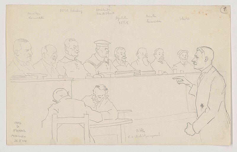 Da Fotografieren verboten ist, liefern Gerichtszeichner, wie Otto D. Franz (1871–1963), Eindrücke vom Prozess. Hier dokumentiert er einen Monolog Hitlers während der Verhandlung. Am 1. April 1924 verhängt das hier ebenfalls dargestellte Gericht skandalös milde Strafen: Hitler geht wegen „ehrenhafter Motive“ fünf Jahre in privilegierte Festungshaft in Landsberg. Dort hält er Besprechungen ab, empfängt Besuche und schreibt an der Hetzschrift „Mein Kampf“. Bereits am 20. Dezember 1924 kommt er vorzeitig frei.