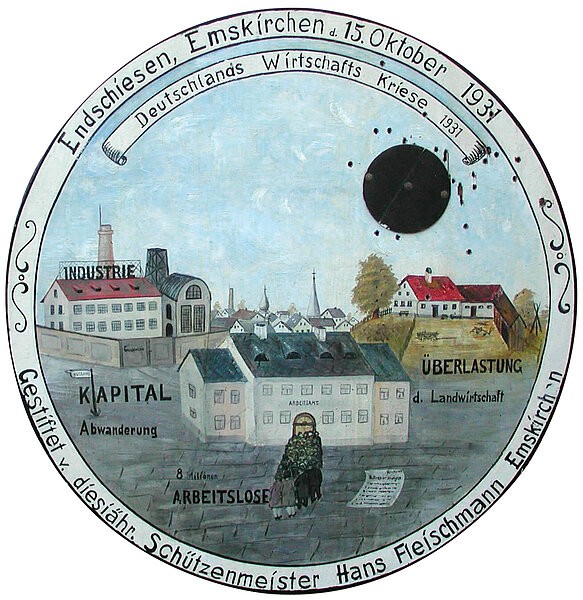 Eine Schützenscheibe zeigt den Krisenkreislauf: Amerikanische Finanzinstitute, die kräftig in Deutschland investiert haben, geben keine Kredite mehr, Aufträge bleiben aus, die Produktion wird zurückgefahren, die Arbeitslosigkeit vervielfacht sich.