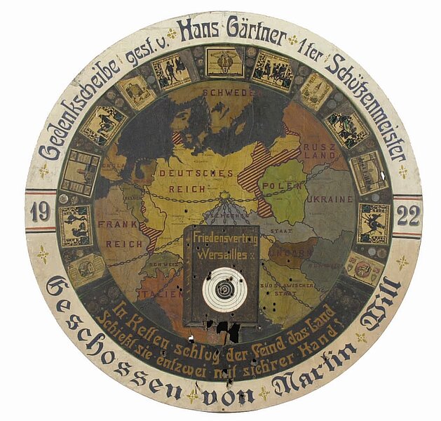 Anlässlich des Ersten Landesschießens der bayerischen Einwohnerwehren stiften Förderer, wie der Freikorpsanführer Franz von Epp, Preise für die Schießwettbewerbe. Das Motiv der Ehrenscheibe zeigt das Selbstverständnis der Einwohnerwehren, die nach der Revolution für den vermeintlichen Schutz der Heimat und die Rückkehr zu „Ruhe und Ordnung“ einstehen.