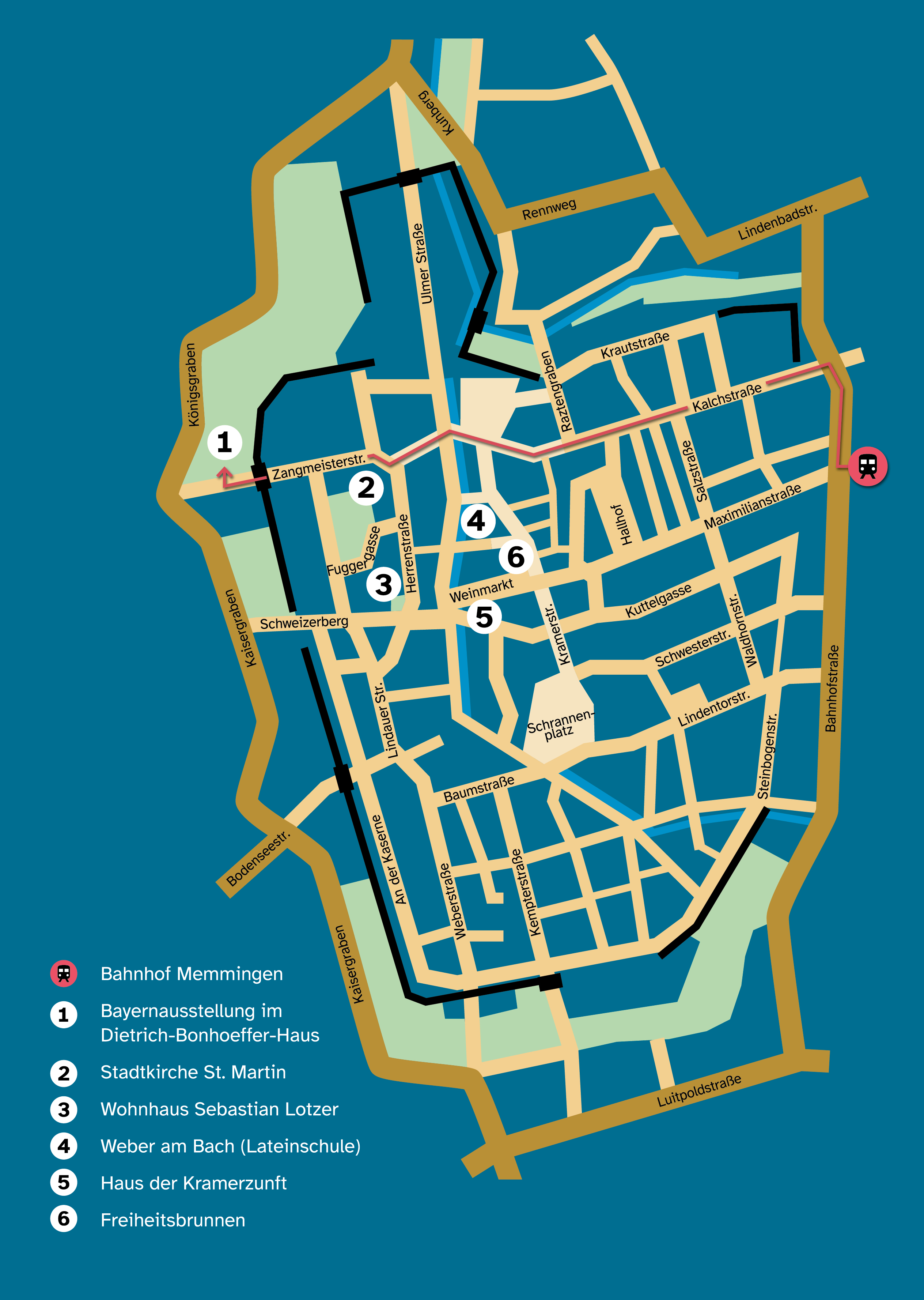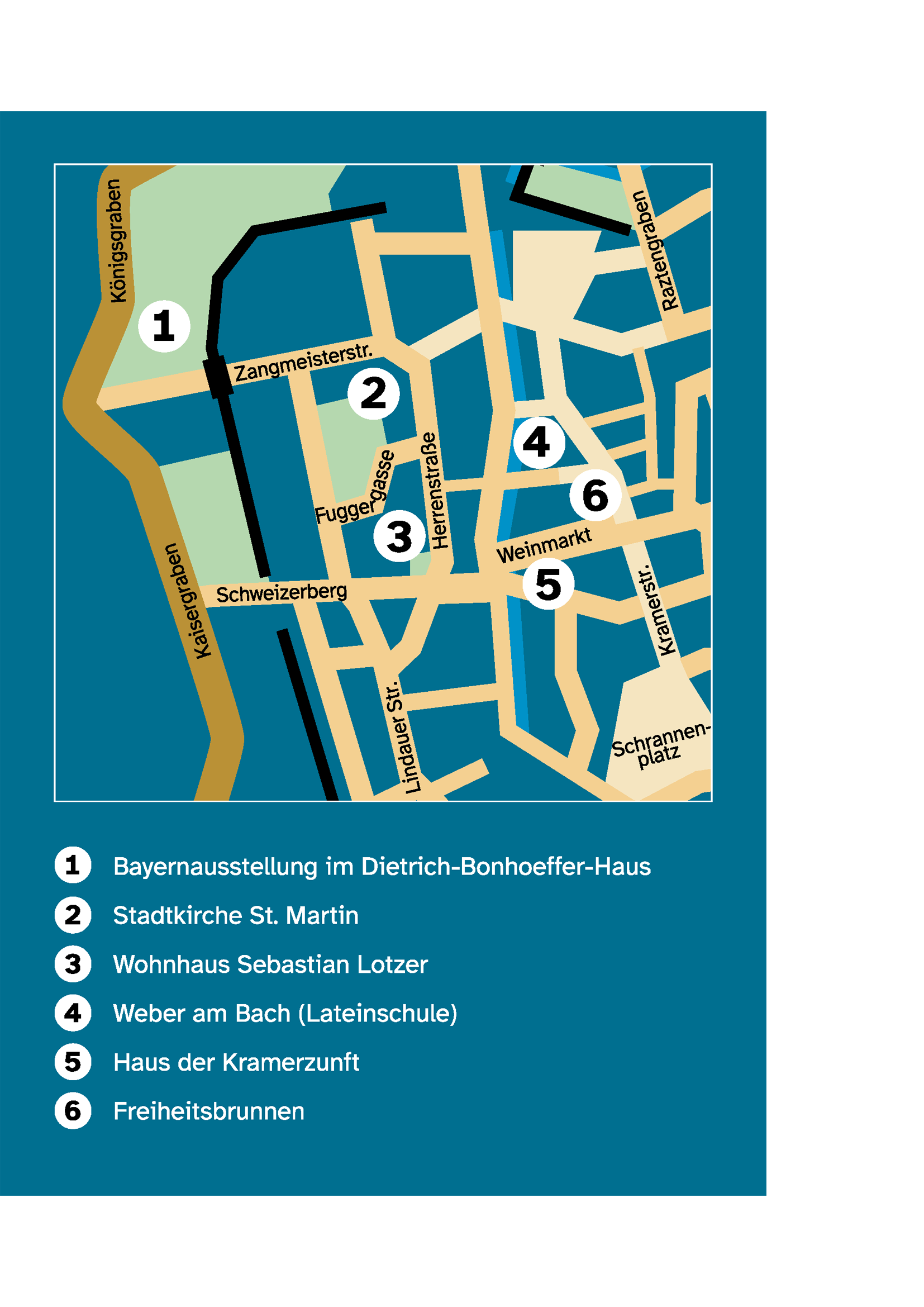 Es wird empfohlen, als erstes die Ausstellung im Dietrich-Bonhoeffer-Haus zu besichtigen (vgl. Karte).