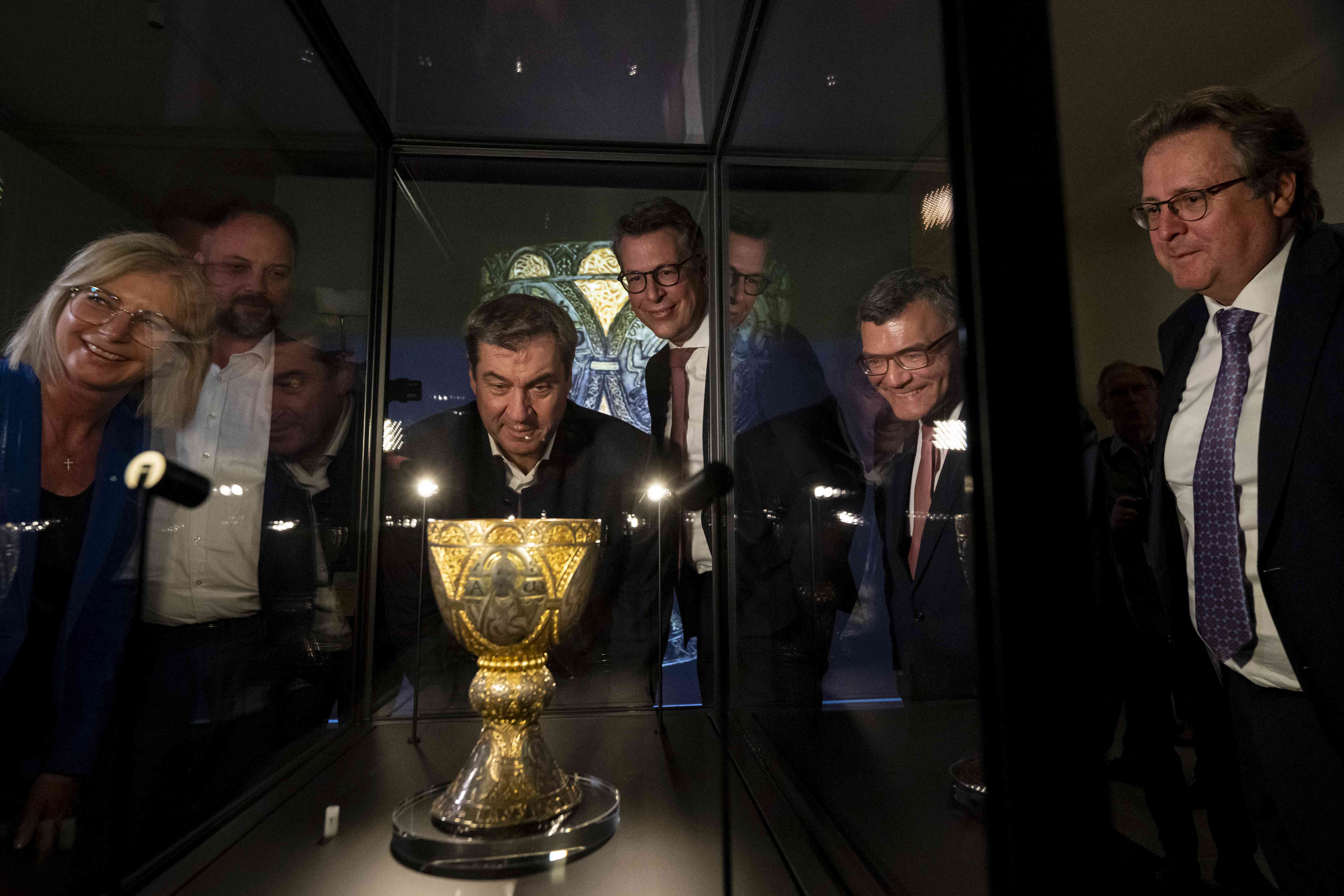 Alle Augen auf den Tassilo-Liutpirc-Kelch (v.l.n.r.): Ulrike Scharf, Bayerische Staatsministerin für Familie Arbeit und Soziales, Freisings Bürgermeister Tobias Eschebacher, der Bayerische Ministerpräsident Markus Söder, der Bayerische Staatsminister für Wissenschaft und Kunst Markus Blume, der Leiter der Bayerischen Staatskanzlei Florian Herrmann und der Direktor des Hauses der Bayerischen Geschichte Dr. Richard Loibl.
