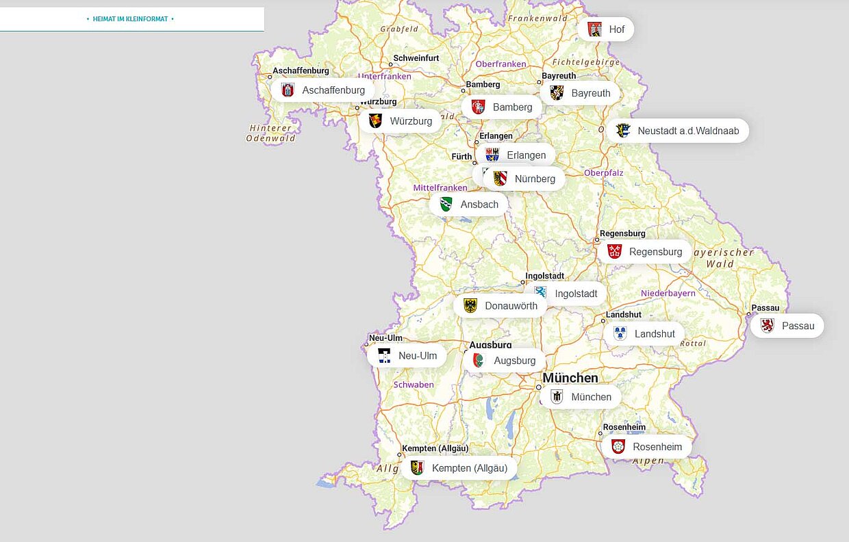 „Heimat im Kleinformat“ ist ein interaktiver Webauftritt des Haus der Bayerischen Geschichte: Im Zentrum steht eine interaktive Karte, mit der man gemeindegenau in die Geschichte Bayerns eintauchen kann. Nutzerinnen und Nutzer wählen eine Gemeinde aus und verfolgen datenbasiert und multimedial aufbereitet, wie sich seit dem 19. Jahrhundert u. a. Bevölkerungszahlen, Religionszugehörigkeiten, Berufsstrukturen und politische Mehrheiten verändert haben. Interaktive Grafiken, Kartenanimationen und Hintergrundinfos helfen dabei, Entwicklungen zu verstehen, Regionen zu vergleichen und historische Wendepunkte einzuordnen.