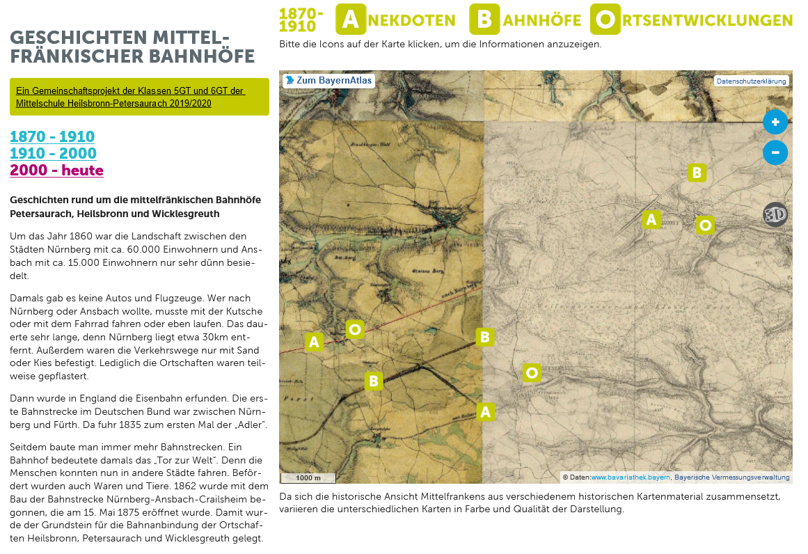Die Präsentation "Geschichten mittelfränkischer Bahnhöfe" ist das Ergebnis eines spannenden Gemeinschaftsprojekts der Klassen 5GT und 6GT der Mittelschule Heilsbronn-Petersaurach im Schuljahr 2019/2020. Die Schülerinnen und Schüler machten sich auf, die Geschichte der Bahnhöfe Petersaurach, Heilsbronn und Wicklesgreuth zu erkunden, die im Jahr 1860 eine entscheidende Rolle für die dünn besiedelte Landschaft zwischen Nürnberg und Ansbach spielten. Damals gab es weder Autos noch Flugzeuge, und die Reise zwischen den beiden Städten, die etwa 30 Kilometer voneinander entfernt liegen, war mühsam und zeitaufwendig.