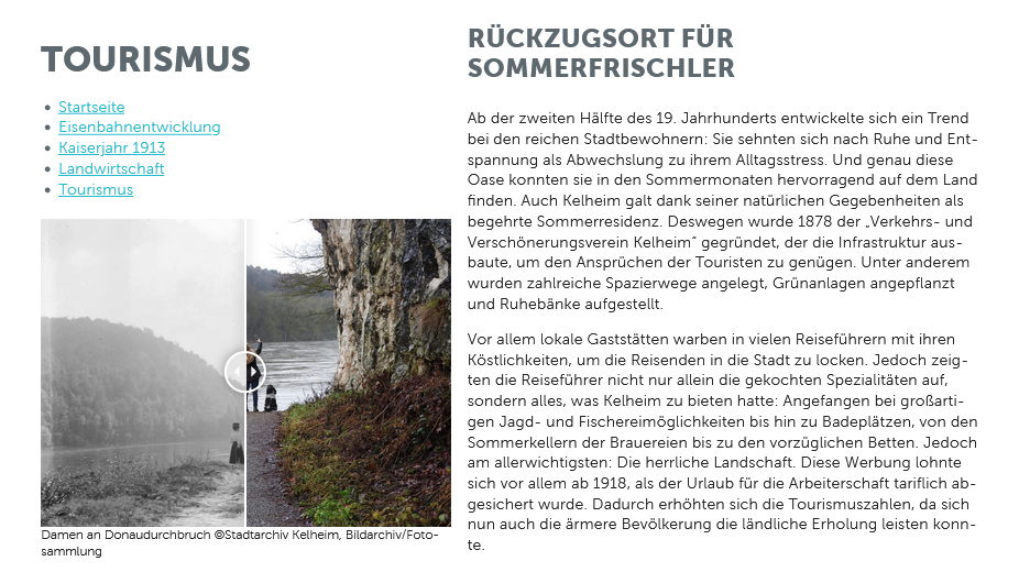 Der Webauftritt "Kelheim um 1900" ist das Ergebnis eines spannenden Projekts von 15 Schülerinnen und Schülern des Donau-Gymnasiums Kelheim, die zu Beginn des Schuljahres 2016/17 den Auftrag „Ab ins Museum!“ annahmen. Mit großem Engagement erforschten sie die Geschichte Kelheims um 1900 und bereiteten ihre Erkenntnisse auf. Dabei setzten sie thematische Schwerpunkte auf Landwirtschaft, Mobilität, Fremdenverkehr und Stromversorgung und beleuchteten zudem den Besuch Kaiser Wilhelms II. im Jahr 1913.