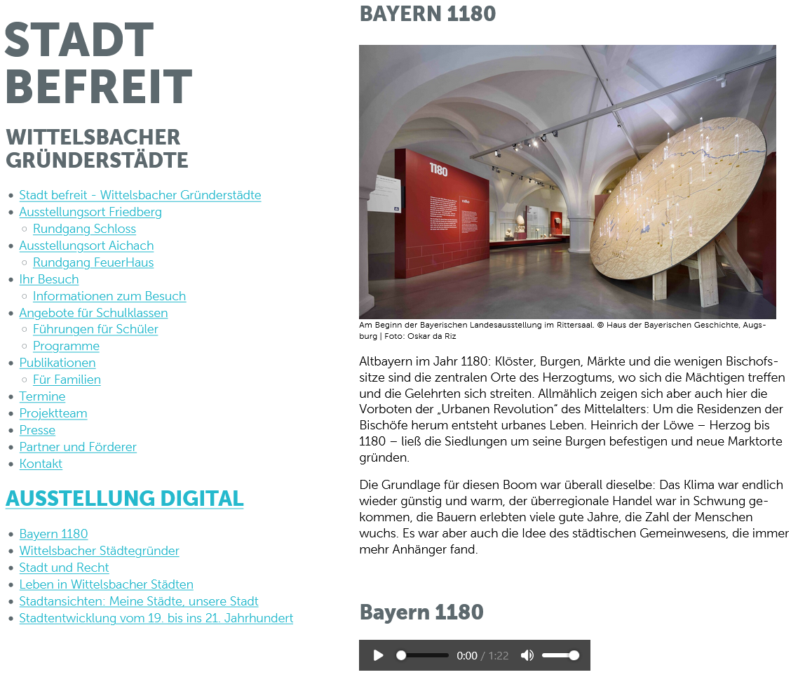 Der Webauftritt zur Bayerischen Landesausstellung 2020 "Stadt befreit – Wittelsbacher Gründerstädte" bietet spannende Einblicke in die Stadtentwicklung im Herzogtum Bayern vom Mittelalter bis in die Frühe Neuzeit. Diese Ausstellung, die in Aichach und Friedberg präsentiert wurde, zeigt, wie Bayern zwischen 1200 und 1300 zum "Städteland" wurde. In diesem Zeitraum legten die Wittelsbacher und andere bayerische Große durch gezielte Stadt- und Marktgründungen den Grundstein für das heute so vertraute System bayerischer Städte. Diese Neugründungen stärkten nicht nur ihre wirtschaftliche, militärische und politische Macht, sondern boten den Menschen in den Städten auch neue Chancen: Schutz, Sicherheit und Handelsfreiheit. Der bis heute bekannte Rechtssatz „Stadtluft macht frei!“ spiegelt diese Entwicklung wider.