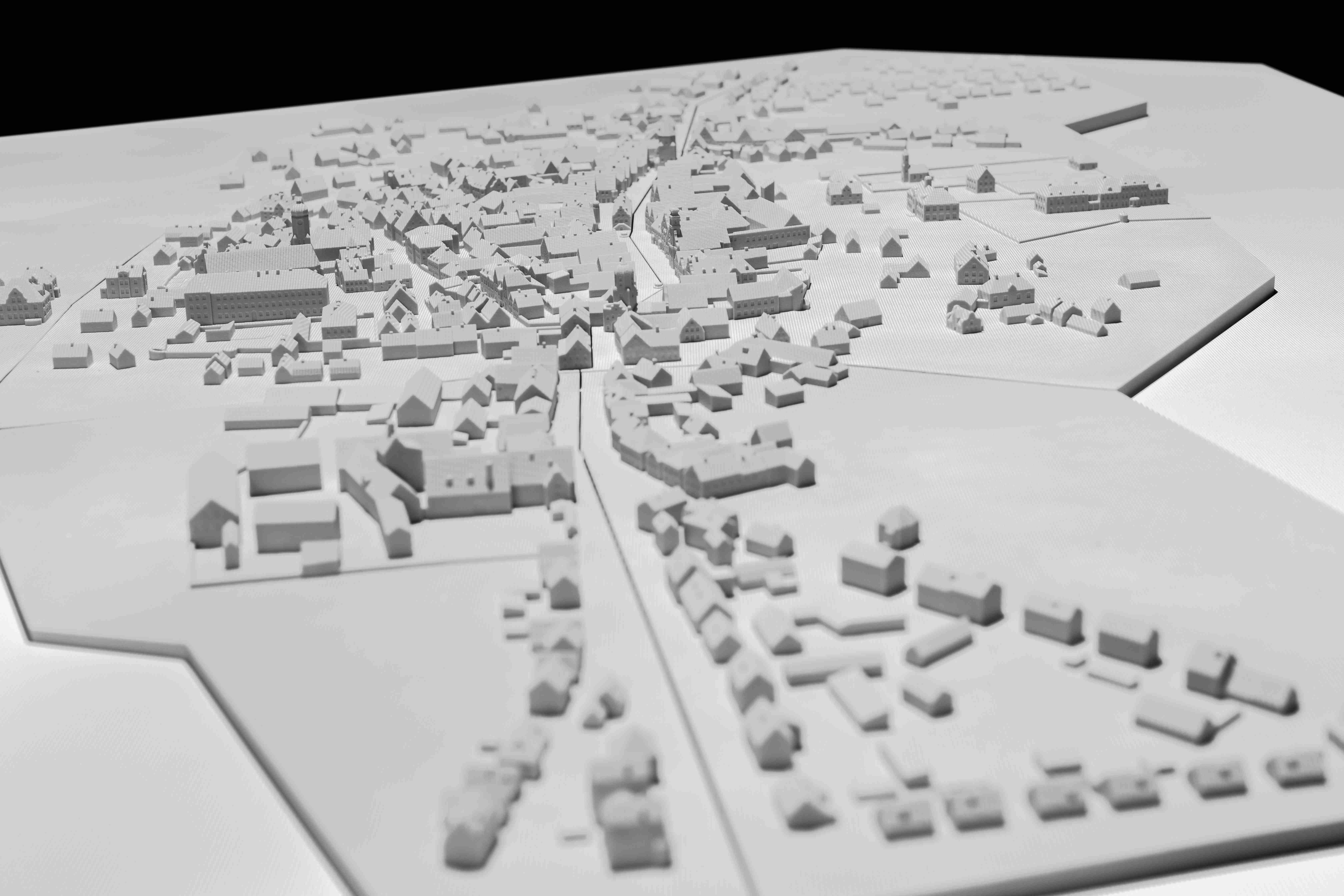 Natürlich wurde auch im Inneren des FeuerHauses fleißig gearbeitet: Der moderne Zweckbau verwandelt sich in eine richtige Ausstellungsfläche. Böden sind verlegt, Wände eingezogen und gestrichen, Lampen installiert und erste Medienelemente werden montiert. Für die Besucherinnen und Besucher wird das FeuerHaus einen Parcours immer neuer Raumeindrücke mit einem Wechsel medialer und analoger Vermittlungstechniken bieten. So startet der Rundgang zum Beispiel mit dem Filmerlebnis „Von der Burg zur Stadt“. Auf zwei Ebenen verbinden sich Real- und Zeichentrickfilm und präsentieren die Ergebnisse archäologischer und historischer Spurensuche. Der Rundgang endet dann wieder in Aichach und zwar im Mai 1914. Damals besuchte das bayerische Königspaar die Stadt, die zu diesem Zweck detailliert dokumentiert wurde. Dieses Bildmaterial war der Ausgangspunkt für die Erstellung eines Stadtmodells von Aichach für das Jahr 1914. Dieses in Zusammenarbeit mit der TU München in 3D-Druck erstellte Stadtmodell ermöglicht es dank zusätzlicher Aufprojektionen, die weitere Geschichte einer typischen „Wittelsbachergründung“ zu erzählen.