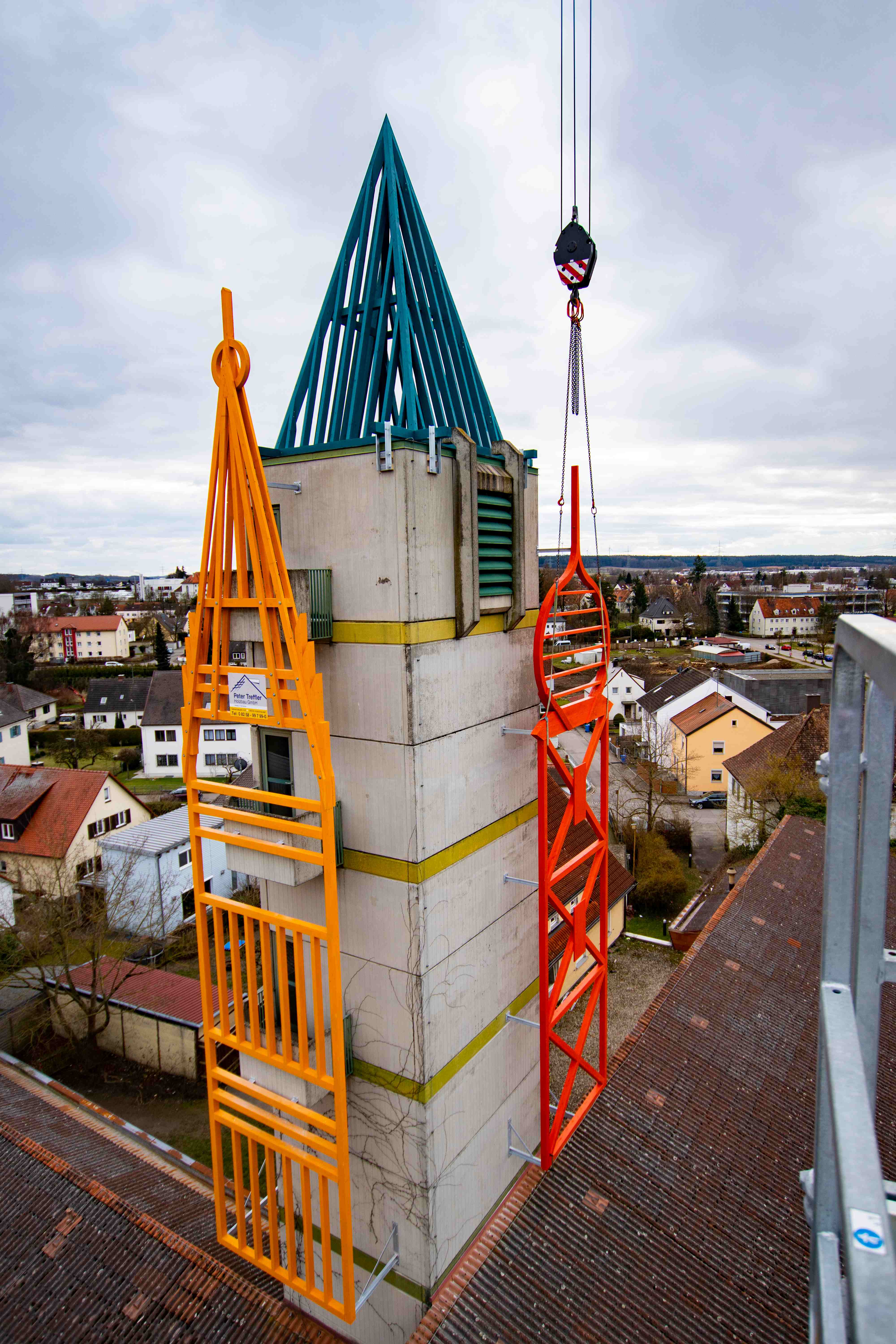 Am 4. März kam dann der Autokran zum Einsatz: er hievte die mehrere tonnenschwere hölzerne Turmspitze auf den Schlauchturm des Feuerwehr-