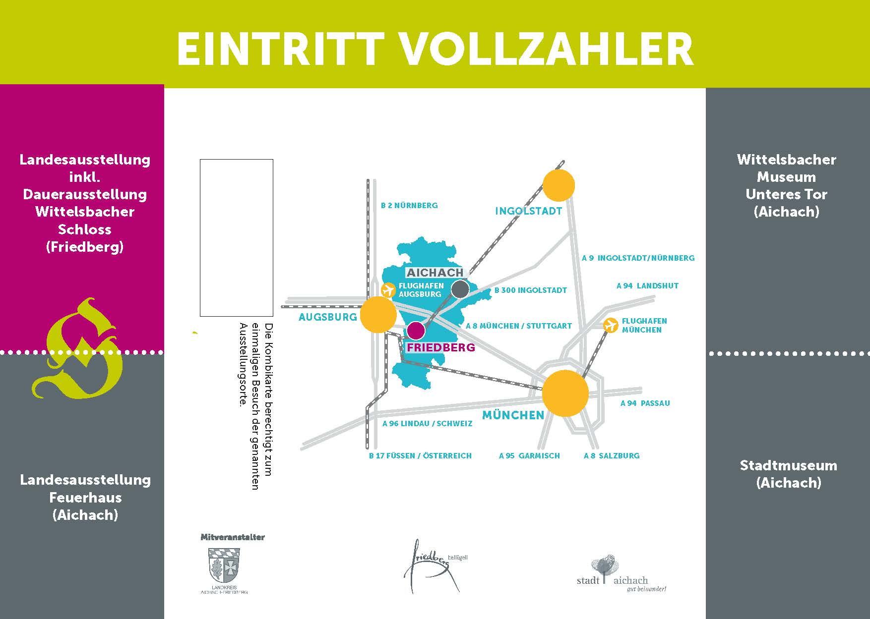 Mit der Kombikarte können die beiden Spielorte der Landesausstellung, die Dauerausstellung des Museums im Wittelsbacher Schloss Friedberg, das Wittelsbacher Museum im Unteren Tor in Aichach und das Stadtmuseum Aichach besucht werden.