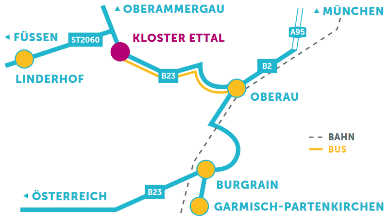 Travel to the state exhibition comfortably and inexpensively with the DB Regio. Take the train to Oberau Train Station. From there, continue to Ettal Abbey (Klostergasthof stop) with bus number 9606 or the free shuttlebus on weekends and holidays.