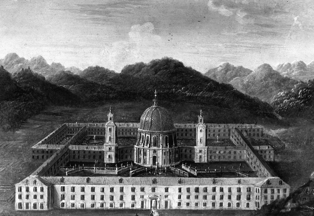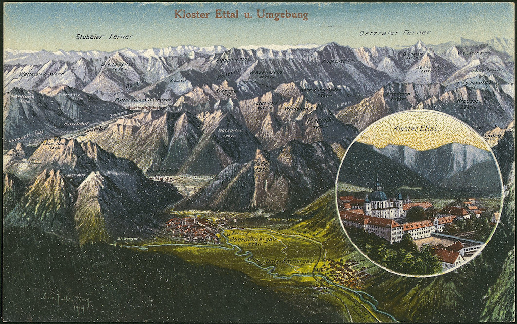 Our exhibition venue, the Benedictine abbey of Ettal at the entrance to the Graswang Valley, is both old and young. It has been in existence ─ with interruptions ─ for nearly 690 years. Its cornerstone was laid in 1330 at the command of Emperor Ludwig the Bavarian. Political, economic and religious reasons induced the emperor to found it. He intended to use Ettal Abbey to mark the southern border of the Duchy of Bavaria, to promote trade with Italy from Augsburg over the Alps, and, finally, to demonstrate his orthodoxy as well.
