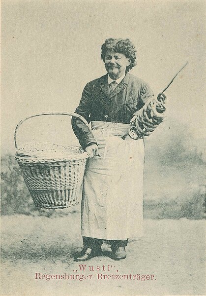 Around 1900, "Wusti" sold his pretzels and sausages from a wicker basket to hungry customers in the alleyways and taverns of Regensburg. He was always particularly polite to the ladies and always greeted them with a deep bow. He also praised his wares at the top of his voice. Unfortunately, he couldn't pronounce the word "sausage" properly, which earned him his nickname.