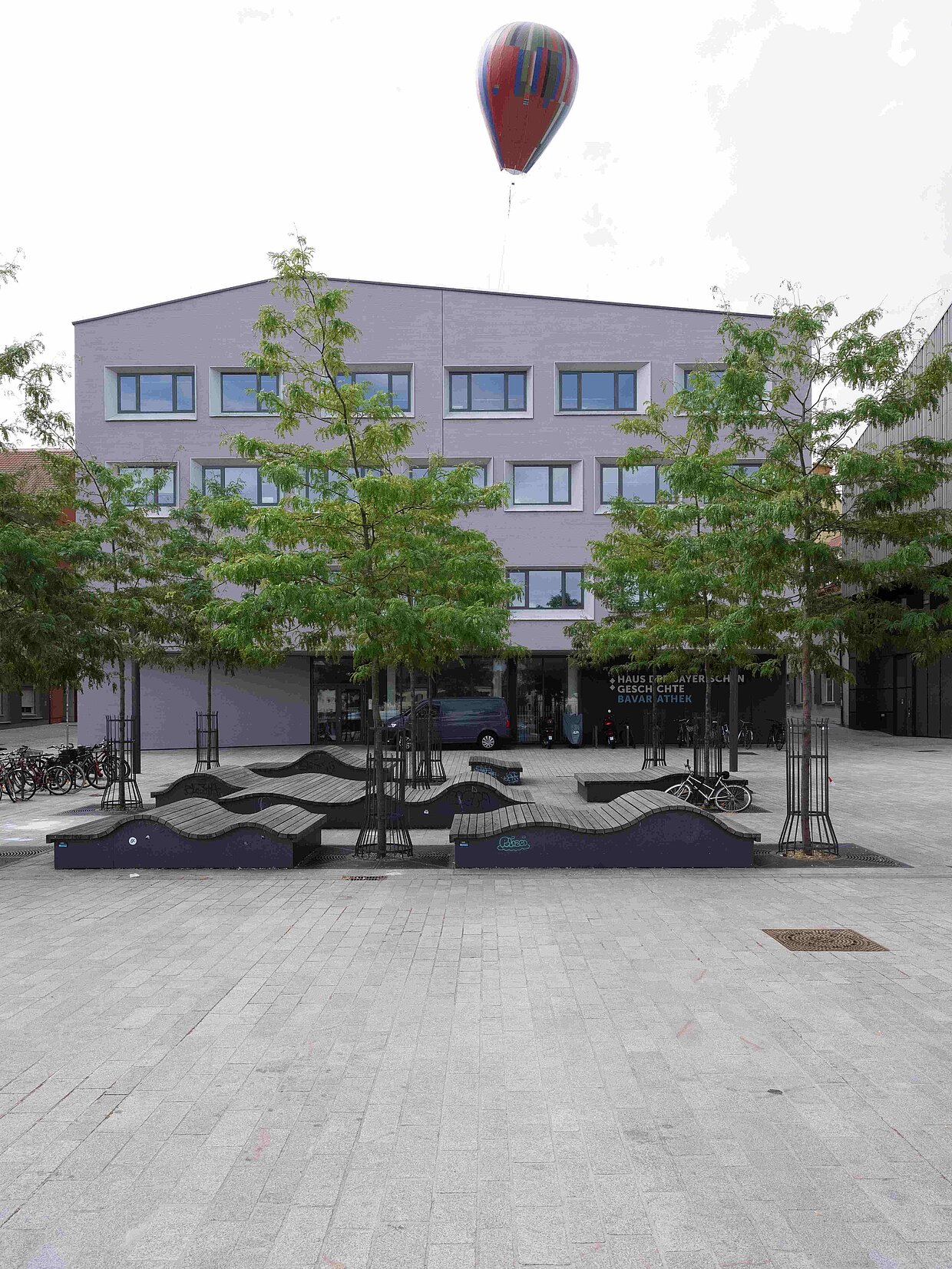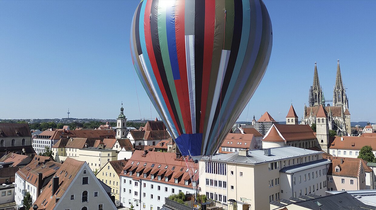 Regensburg, 11.9.2024. Am kommenden Sonntag, 15.9. und am Montag, 16.9. wird zwischen 10 und 16 Uhr der Himmel über dem Dach der Bavariathek am Haus der Bayerischen Geschichte in Regensburg wieder bunt: wenn das Wetter es zulässt wird der Ballon der Münchner Künstlerin Katharina Gaenssler wieder steigen. Die Anlässe dazu geben am Sonntag der Internationale Tag der Demokratie und am Montag der 45. Jahrestag der spektakulären Ballonflucht der Familien Wetzel und Strelzyk, denen mit ihrem selbst gebauten Ballon im Jahr 1979 die Flucht aus der DDR nach Naila in Oberfranken gelungen war. Ein Schmankerl ist zusätzlich für den Sonntag geplant: bei gutem Wetter steigt der Ballon zwischen 19:30 und 21 Uhr beleuchtet in Richtung Abendhimmel.