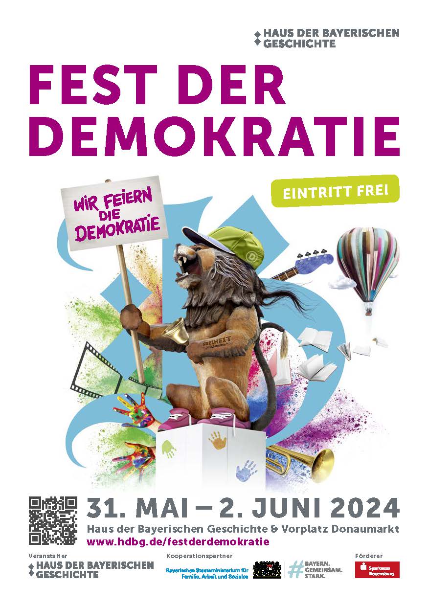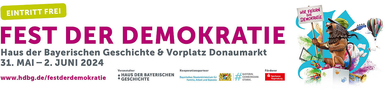 Lust auf ein Fest, das nicht nur Spaß macht, sondern auch etwas bewegt? Dann auf zum Fest der Demokratie von Freitag, 31. Mai bis Sonntag, 2. Juni 2024 im Haus der Bayerischen Geschichte und auf dem Donaumarkt am Museumsufer.