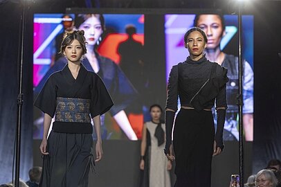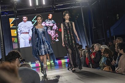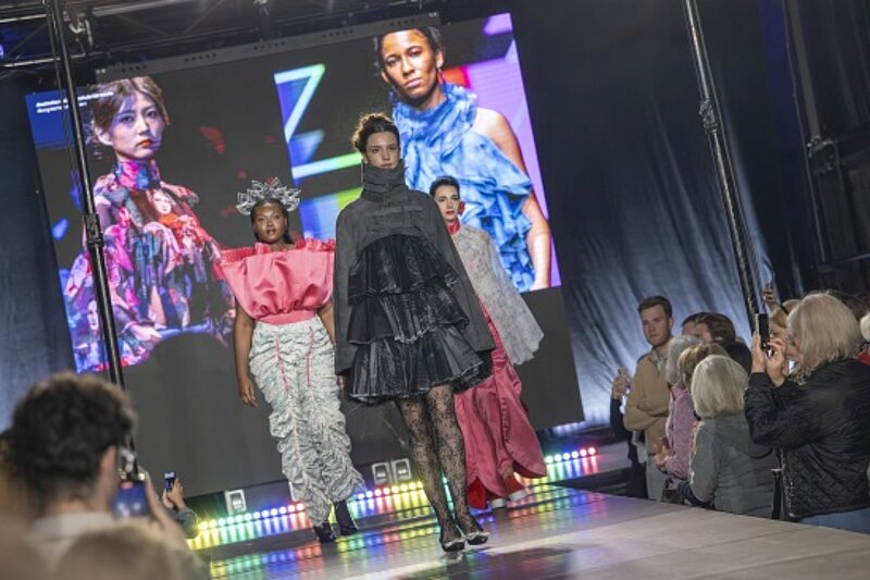 Wie die Entwürfe entstanden sind erzählten die Schülerinnen und Schüler der Meisterschule im Gespräch mit Valerie Fischer bei den Laufsteggesprächen selbst (erstes Bild):