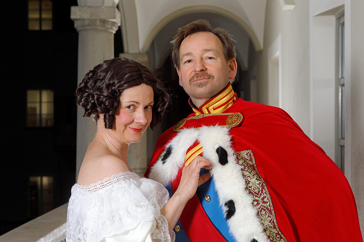 Regensburg, 4. September 2025. Am Sonntag, 21. September 2025 findet in München wieder der traditionelle Trachten- und Schützenzug statt und das Haus der Bayerischen Geschichte ist dabei! Die Zugnummern 52 a und 52 b gehören zur Entourage von König Ludwig I. und Königin Therese von Bayern. Der Protagonist der diesjährigen Bayerischen Landesausstellung und seine Gattin Therese liefern schließlich auch die Grundlage für den weltweit berühmten Umzug in München. Der Trachten- und Schützenzug wurde im Jahr 1835 zu Ehren der Silberhochzeit des königlichen Paares und zum 25jährigen Bestehen des Oktoberfestes erstmals durchgeführt. Anlässlich der Bayerischen Landesausstellung des Hauses der Bayerischen Geschichte ist das Königspaar heuer mit vertreten. In die Rolle von König Ludwig I. schlüpft der Schauspieler Holger Matthias Wilhelm, bekannt als der Brunnerwirt in der BR-Fernsehserie „Dahoam is Dahoam“. Die Regensburger Schauspielerin Christine Elsa Wagner steht ihm als seine Gattin Therese von Bayern zur Seite.